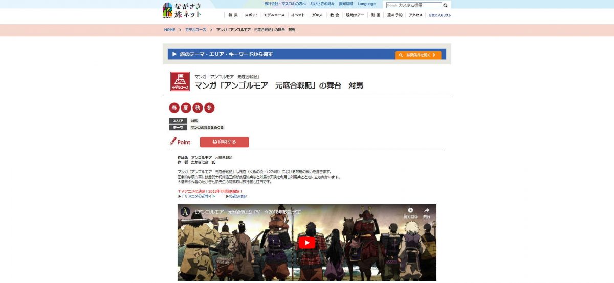 対馬の農林漁業体験活動を推進する組織「対馬グリーン・ブルーツーリズム協会」の会長板井達夫(いたいたつお)さんが”つたえる”対馬の魅力や、1274年に起きた元寇(文永の役)を題材にしてアニメ化された漫画「アンゴルモア元寇合戦記」のメイン舞台である対馬浅茅湾などがピックアップされています。又、長崎観光ポータルサイト「ながさき旅ネット」には「アンゴルモア元寇合戦記」の舞台を巡るモデルコースも特集されています。
